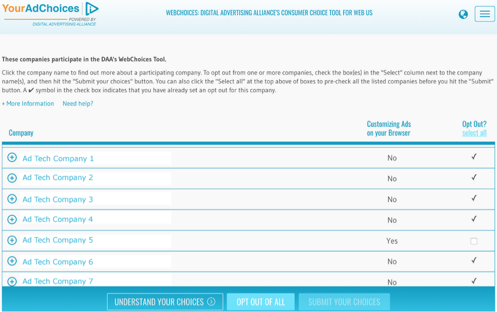 You can click on “More Information” for more information about interest-based advertising. You can also see the companies for which status information was not completed by reviewing the top of the company listing at the “Company” column. You can also see which opt-out requests were not completed on the WebChoices landing page, if any, by inspecting for unchecked boxes under the “Opt Out?” column.